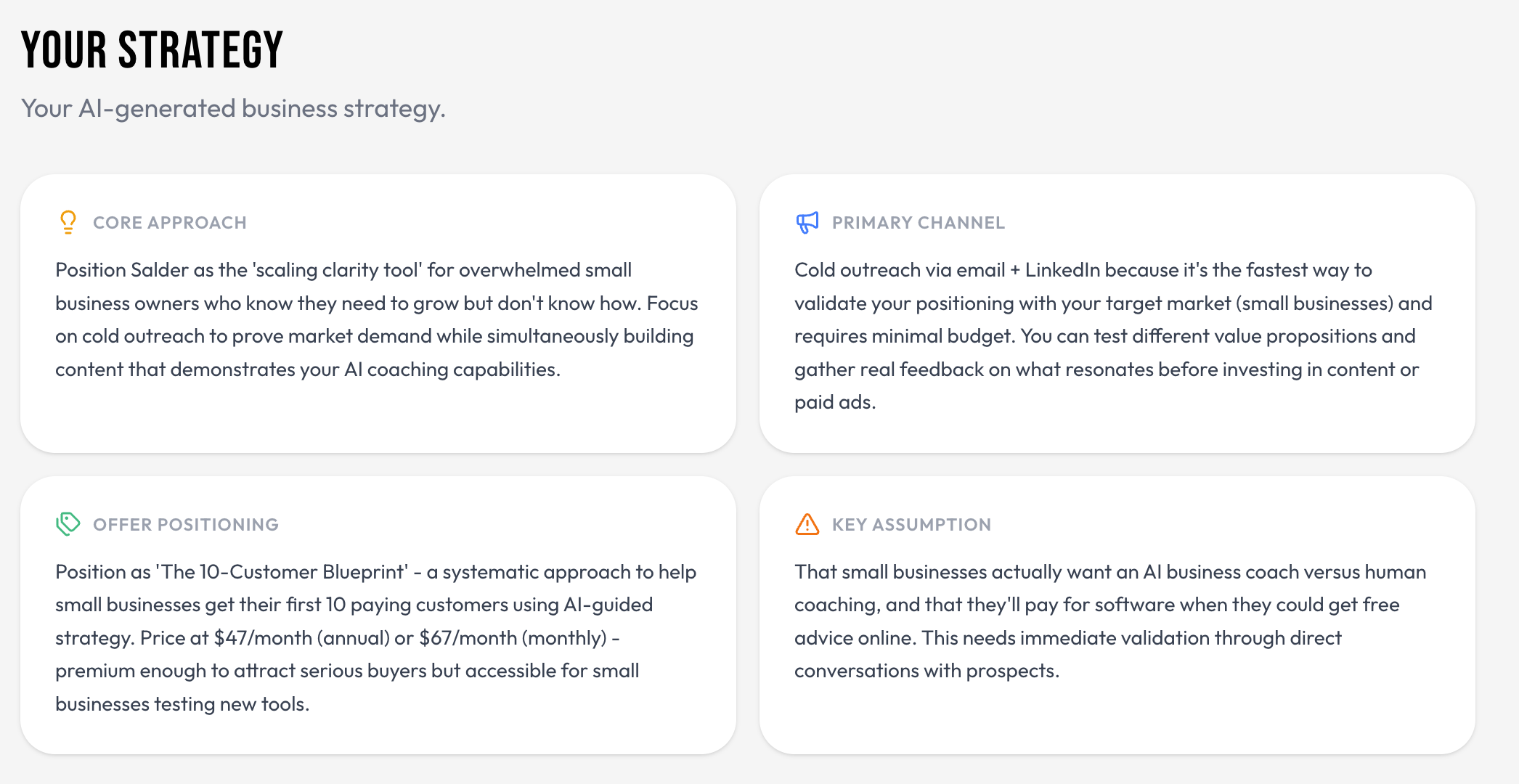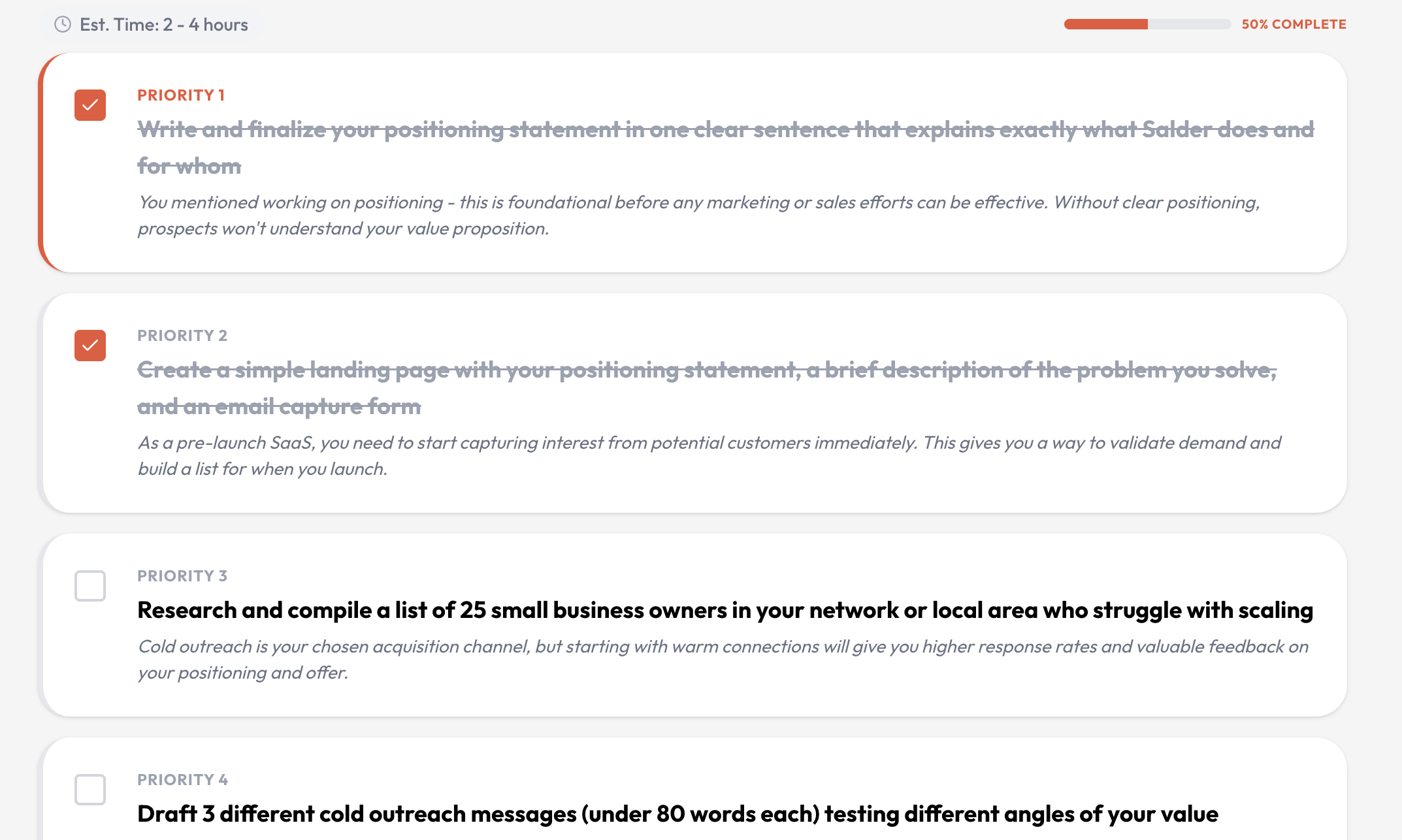 Salder builds your go-to-market strategy, action plan, and first set of daily tasks.