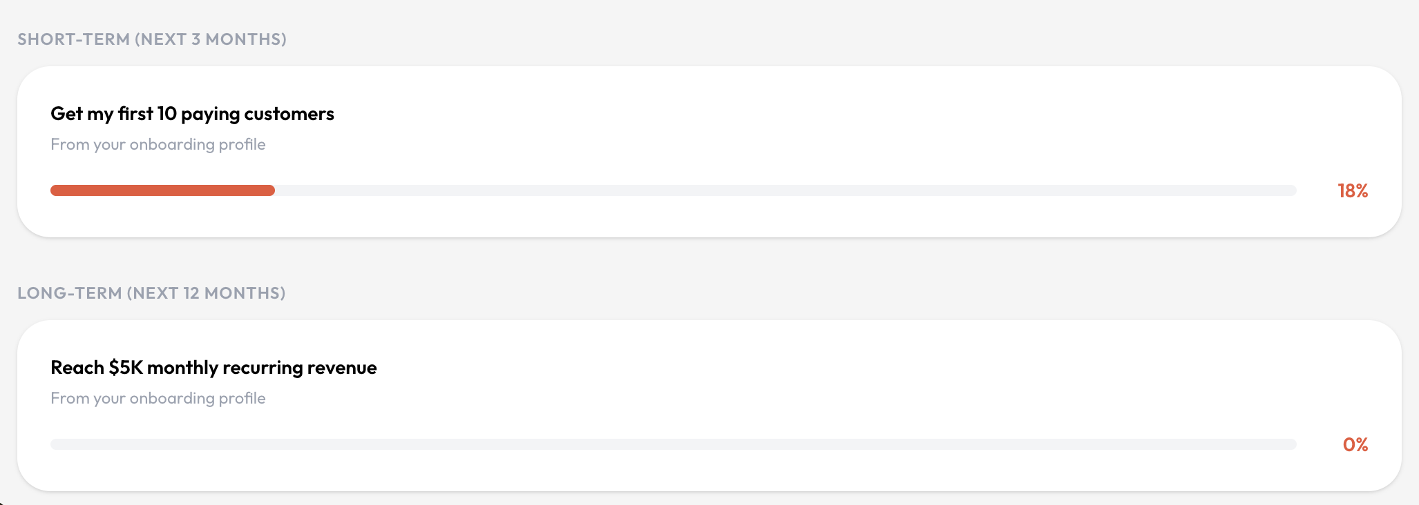 Set revenue targets, user milestones, and launch deadlines. Track your MRR growth and know if you're on pace.